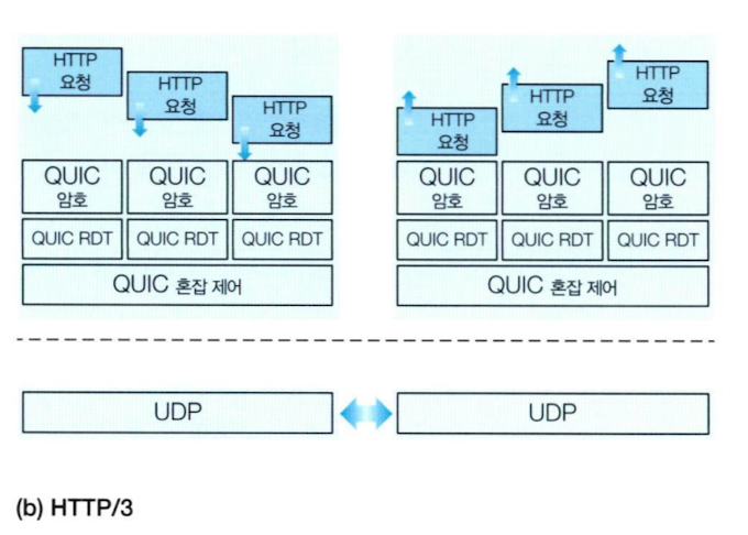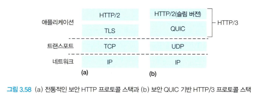 QUIC(Quick UDP Internet Connections, 빠른 UDP 연결) 프로토콜 UDP를 하위 트랜스포트 계층 프로토콜로 사용하는 애플리케이션 계층 프로토콜 애플리케이션 설계자는 애플리케이션 계층에 항상 ‘자신의 프로토콜을 확장’ 할 수 있다