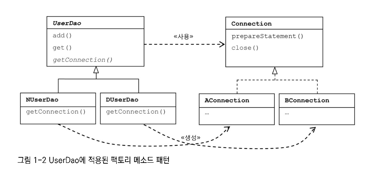 슈퍼클래스에 기본적인 로직의 흐름을 만들고, 그 기능의 일부를 추상 메소드나 오버라이딩이 가능한 protected메소드등으로 만든 뒤 서브클래스에서 이런 메소드를 필요에 맞게 구현해서 사용하는 방법을 디자인 패턴에서 템플릿 메소드 패턴 이라고 한다. 서브클래스에서 구체적인 오브젝트 생성 방법을 결정하게 하는 것을 팩토리 메소드 패턴이라고 부르기도 한다.