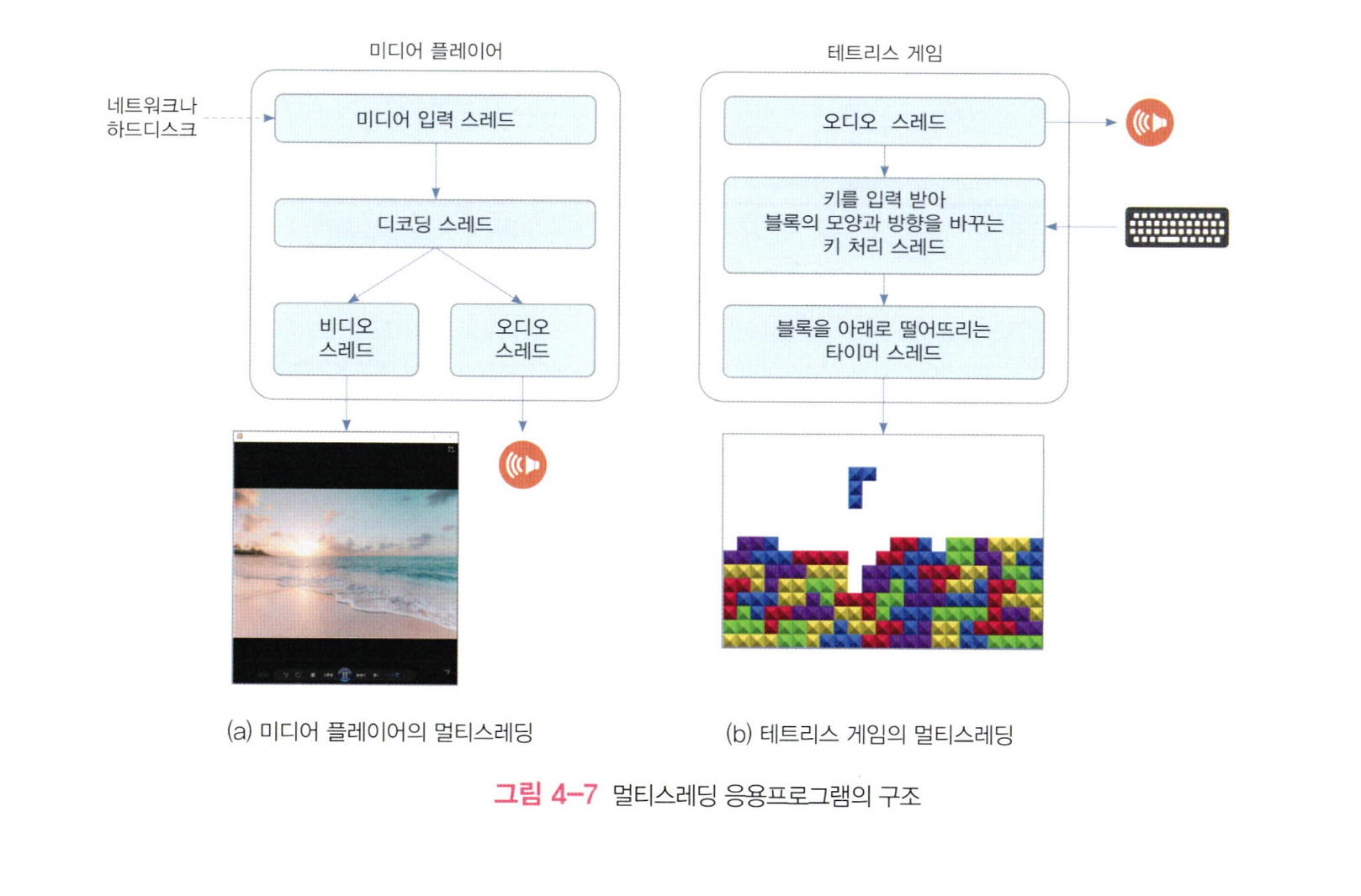 - 응용프로그램을 멀티스레드로 잓어하면 한 스레드가 블록되어도 다른 스레드들은 스케줄링되어 실행되기때문에 전체블록되는 일은 일어나지 않음