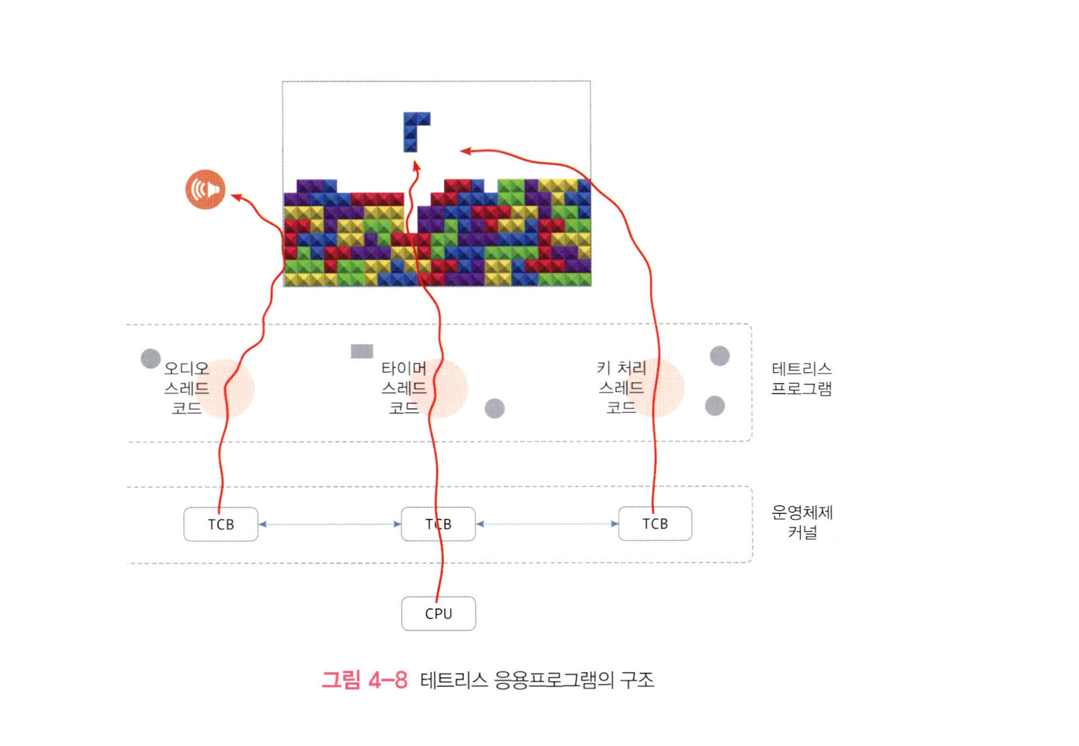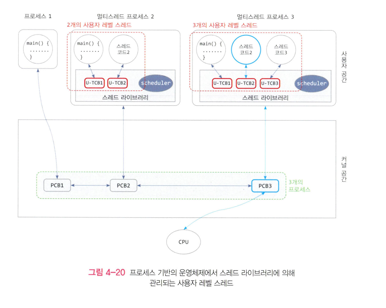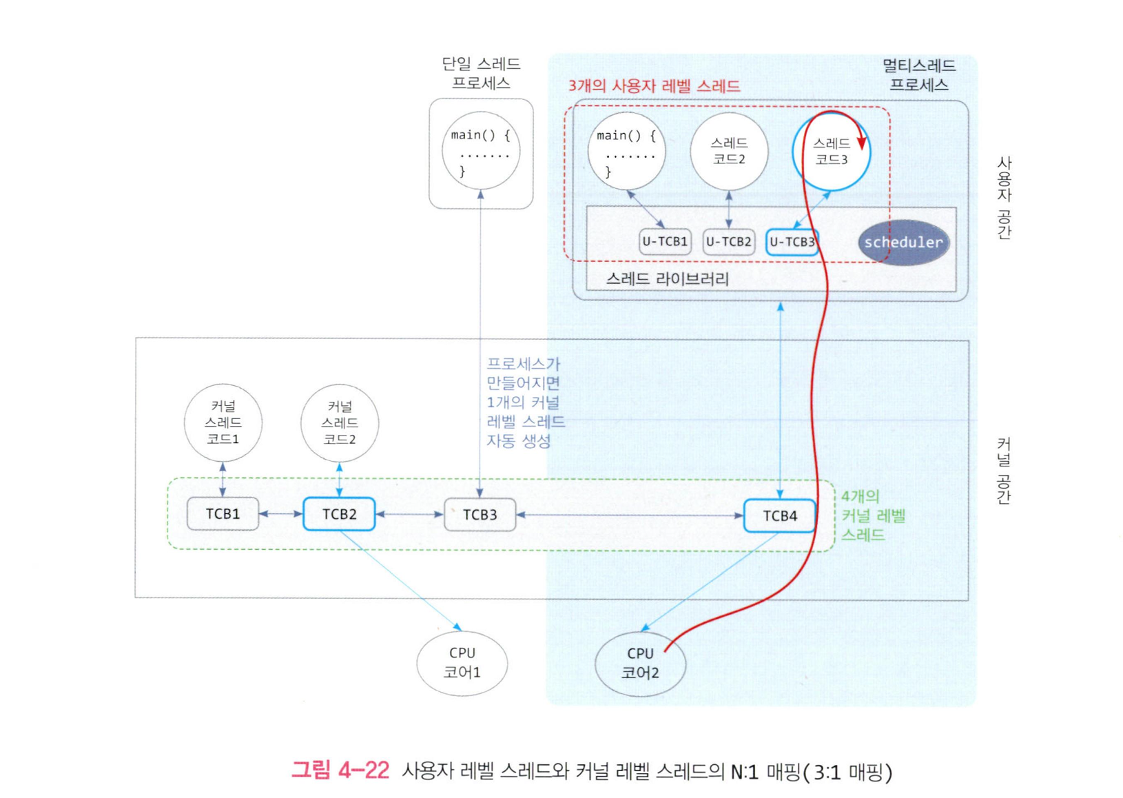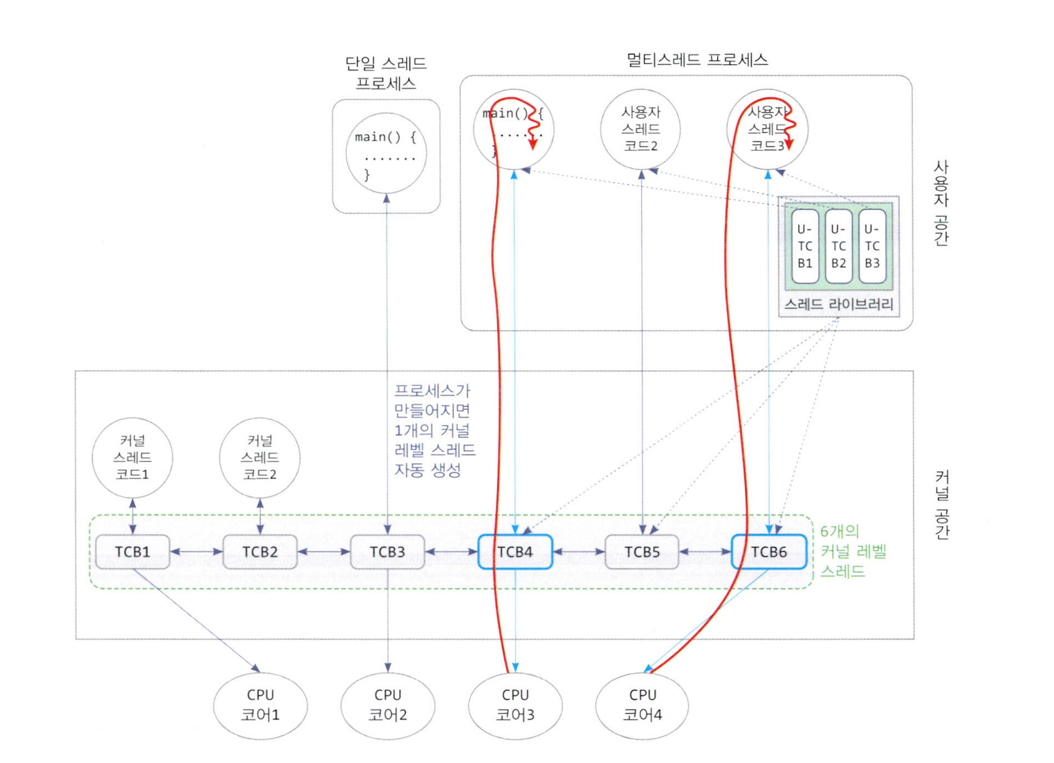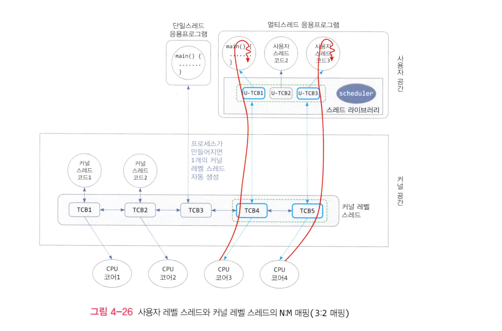시스템 호출을 통해 스레드를 만들면 tcb가 커널 공간에 만들어지고 tcb에 기록된 스레드 코드의 주소는 응용프록 램의 코드를 가리킴 커널 스케줄러에 의해 스케줄링되면 cpu는 응용프로그램에 작성된 사용자 코드를 실행함