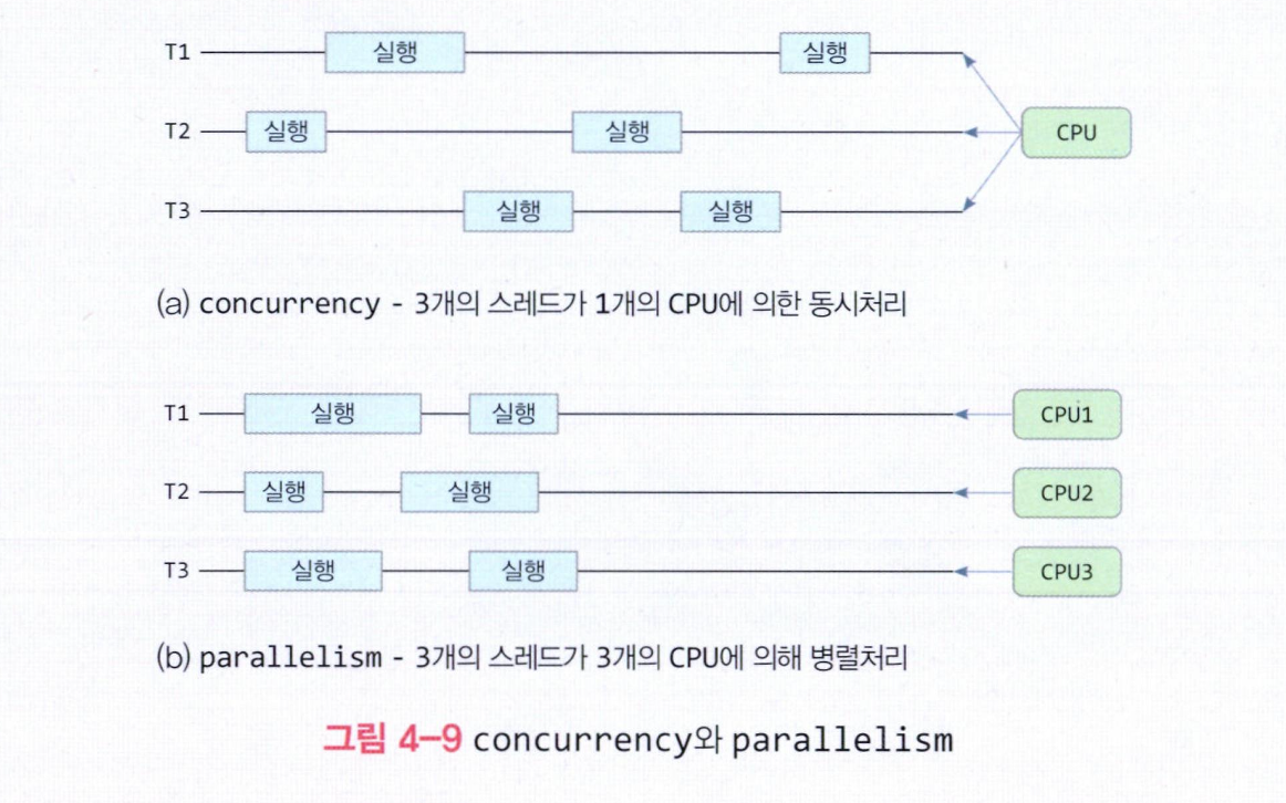 - 스레드가 입출력을 기다리는 동안 cpu가 다른 스레드를 실행하거나 스레드에게 할당된 타임 슬라이스가 다할때 cpu가 다른 스레드에게 할당하야 실행시키는 방식 parellelism(병렬성)