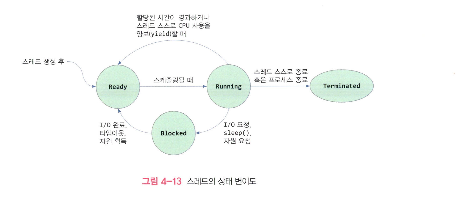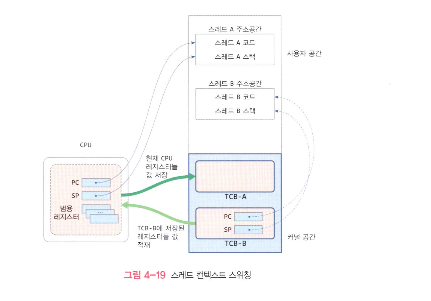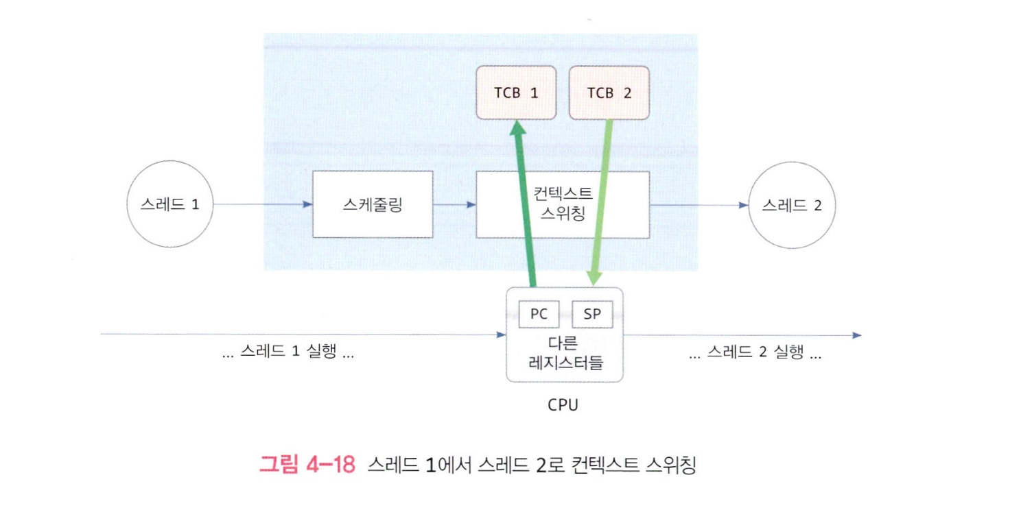 - 운영체제 커널이 스케줄링을 통해 한개의 tcb를 선택하고 cpu에게 tcb에 저장된 주소에서 스레드 코드를 실행하도록 함