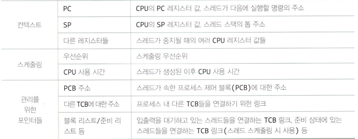 - PCB에 저장된 정보를 환경 컨텍스트라고 하고 TCB에 저장된 정보를 실행 컨텍스트라고 함