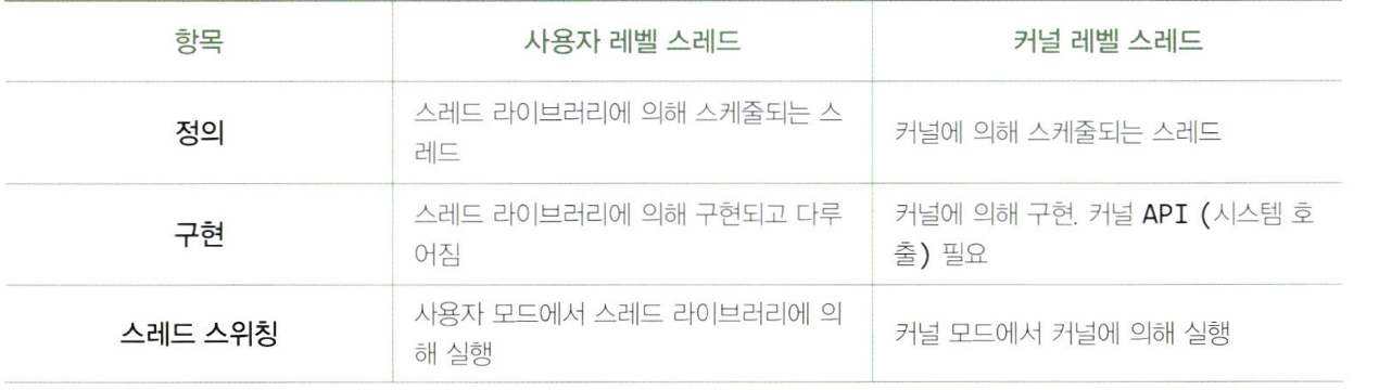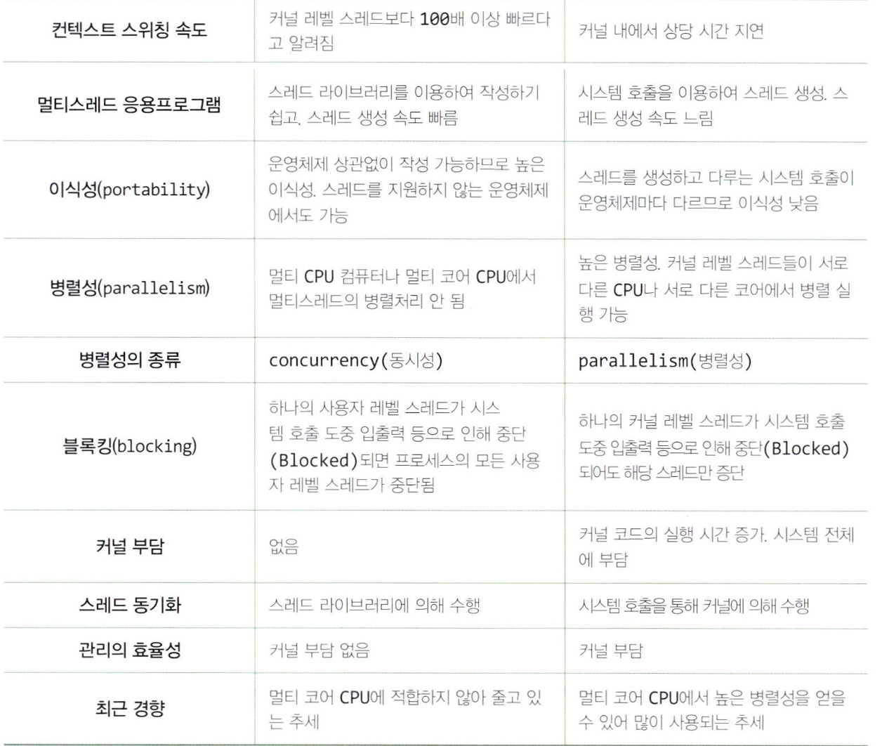 사용자 레벨 스레드 < 커널 레벨 스레드 사용자 레벨 스레드 : 하나의 cpu코어에서 스레드 라이브러리에 의해 번갈아 실행, 병렬적으로 실행 x