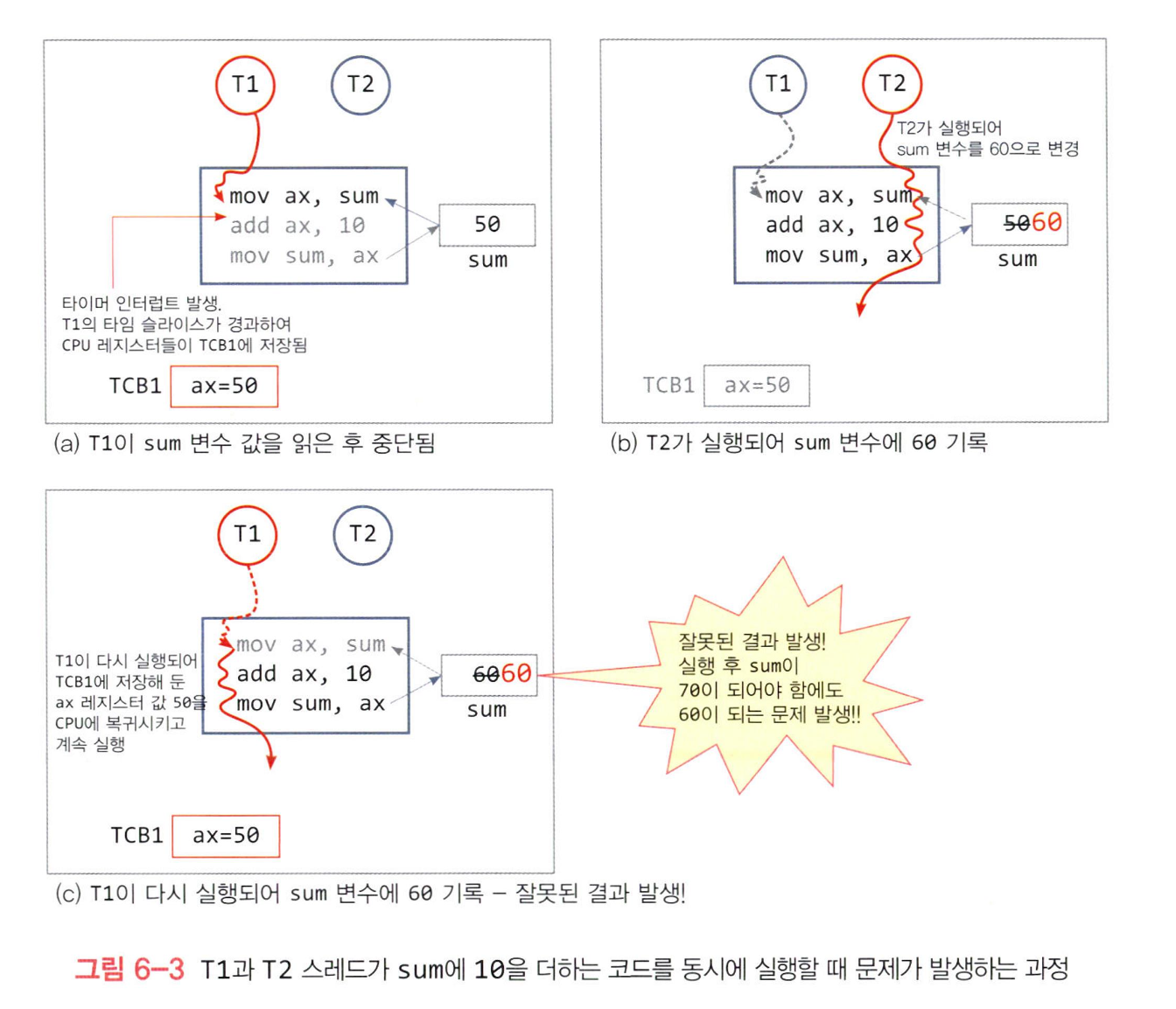 - sum = sum + 10 이 하나의 cpu 명령이 아님 → 한 스레드가 실행을 완전히 마칠 때까지 다른 스레드가 이 코드를 실행하는것을 막지 못함