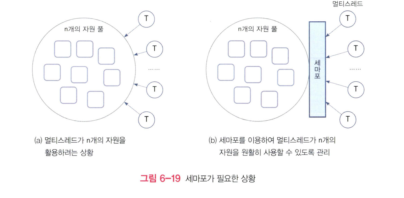 - n개의 자원이 있는 상황에서 멀티스레드가 자원을 사용하려고 하는데 자원이 모두 동날때 자원을 사용하려는 스레드는 기다려야하고 자원을 다 사용한 스레든느 이를 알려 대기중인 스레드가 자원을 사용할 수 있도록 관리하는 주체가 필요함 ⇒ 세마포