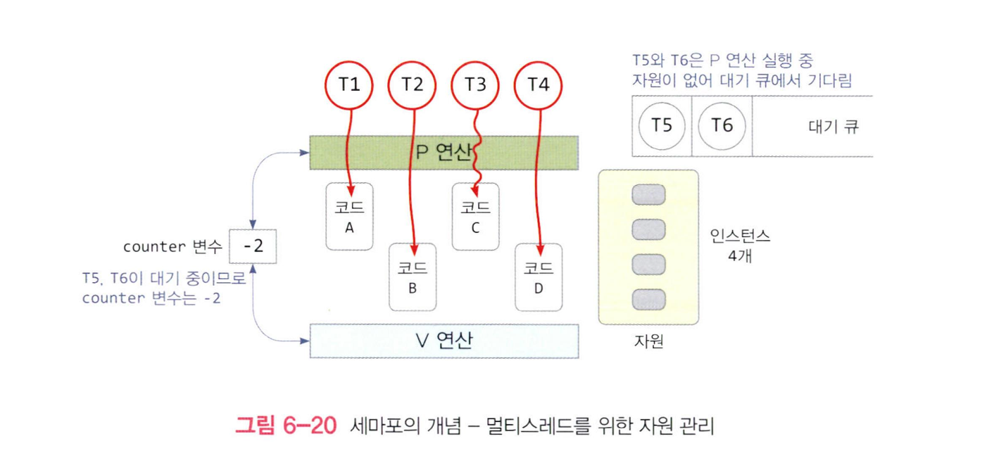 - V 연산에서 사용 가능한 자원이 생기면 스레드를 깨워 자원 사용을 허락 바쁜 대기(busy-waiting) 세마포