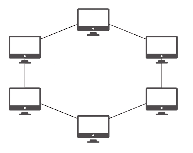 - 링형 토폴로지 각각의 노드가 양 옆의 두 노드와 연결하여 전체적으로 고리처럼 하나의 연속된 길을 통해 통신