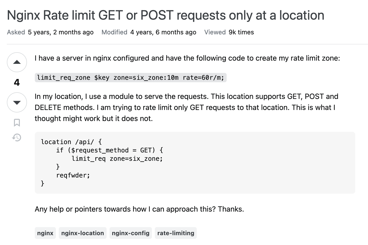}map 지시어를 사용하여 POST 요청일 때만 클라이언트 IP를 저장하고, 다른 요청은 빈 문자열로 설정하였다. 이렇게 하니 POST 요청에만 rate limit이 적용되었다.