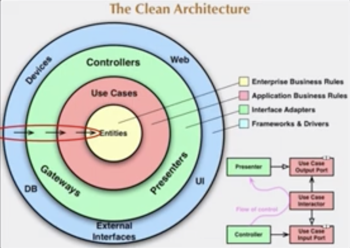 - 엔티티 중심, 유즈케이스가 감싸는 형태, 어댑터(controller, gateway, presenters)가 바깥을 감싸는 형태
