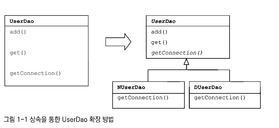 - 확장된 기능인 DB 커넥션을 생성하는 코드를 다른 DAO 클래스에 적용할 수 없다.