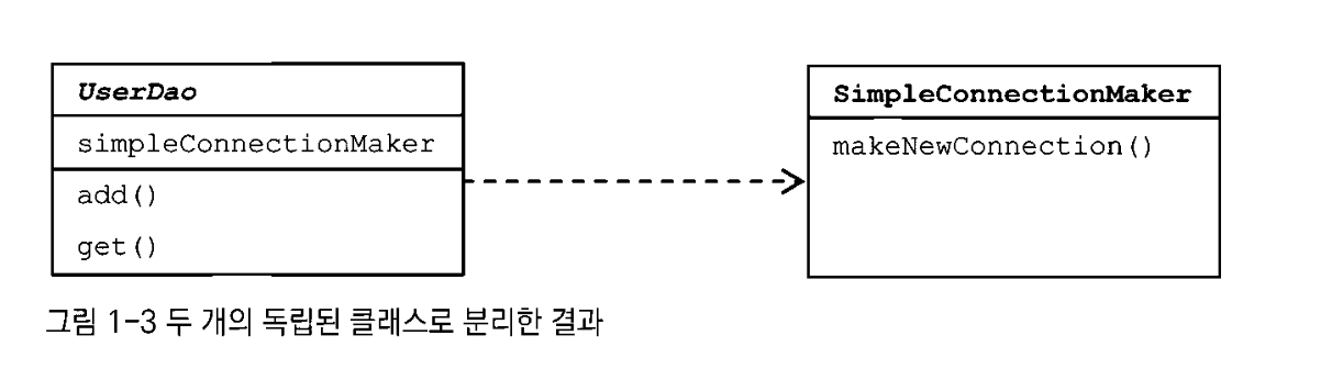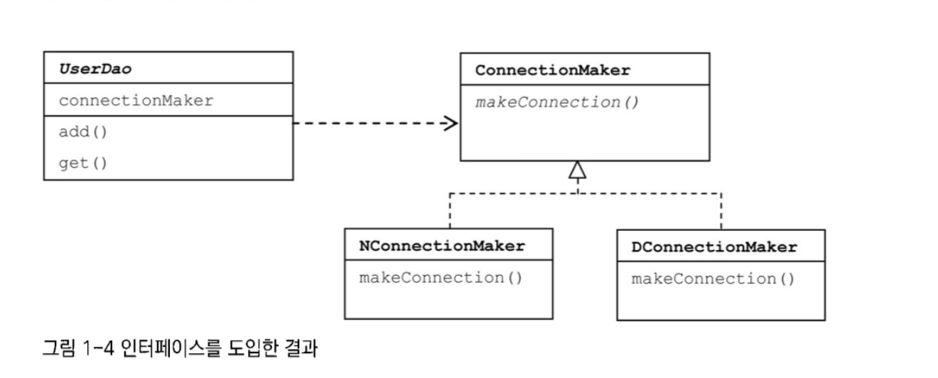Connection c = simpleconnectionMaker.opinConnection()문제점 2) DB 커넥션을 제공하는 클래스가 어떤 것인지 UserDao가 구체적으로 알고 있어야 함