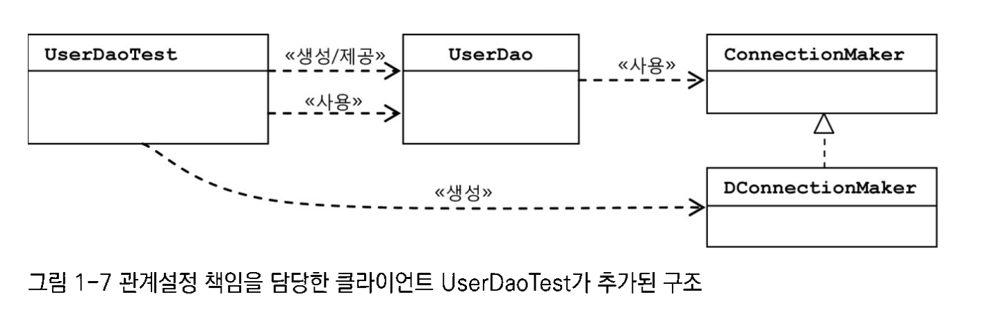 userDao에는 어떤 ConnectionMaker 구현 클래스를 사용할 지 결정하는것 = UserDao와 UserDao가 사용할 ConnectionMaker의 특정 구현 클래스사이의 관계를 설정해주는것에 관한 관심