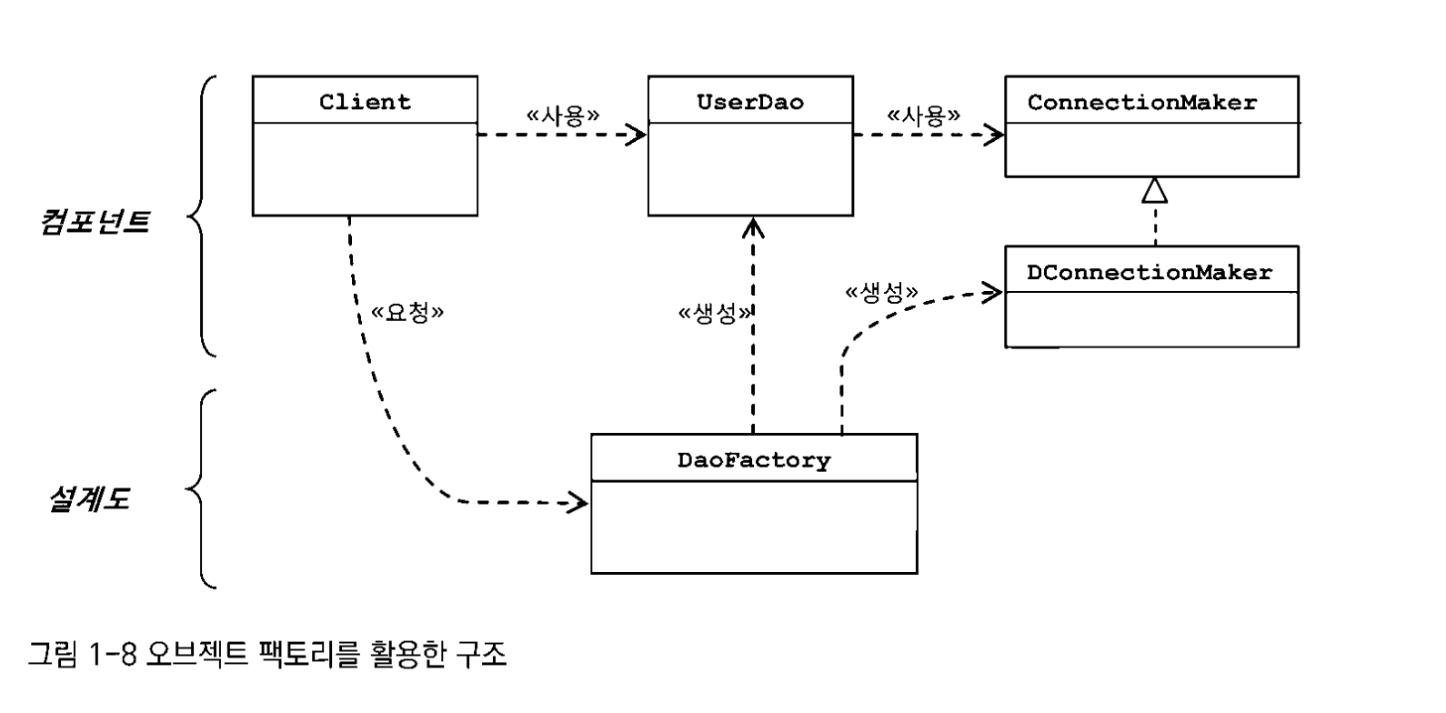 UserDao, ConnectionMaker : 애플리케이션의 핵심적인 데이터 로직과 기술 로직 담당 - 실질적인 로직 DaoFactory : 애플리케이션의 오브젝트들을 구성하고 관계를 정의하는 책임 - 컴포넌트의 구조와 관계를 정의