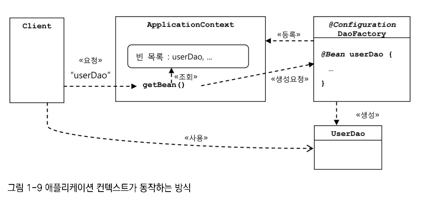 UserDao와 ConnectionMaker 구현 클래스의 오브젝트를 만드는 것 그렇게 만들어진 두 오브젝트가 연결돼서 사용될 수 있도록 관계를 맺어주는 것