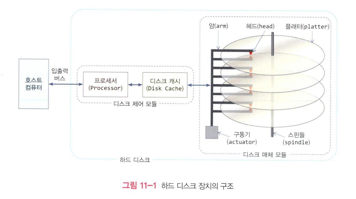 - 디스크 캐시(disk cache) : 입출력 데이터를 임시 저장하는 장치, 운영체제가 디스크에 저장하기 위해 보낸 데이터는 디스크 캐시에 먼저 저장되고 프로세서가 디스크 캐시에서 플래터로 저장함, 디스크 입출력 응답 시간 감소