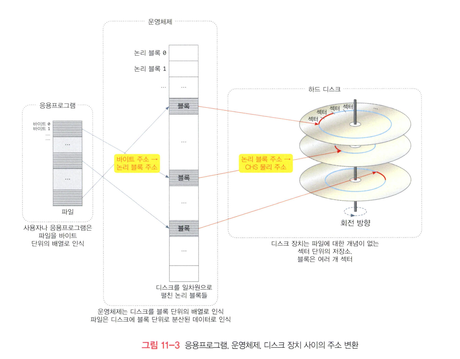 파일 내바이트 주소 → 논리 블록 주소 → CHS 물리 주소