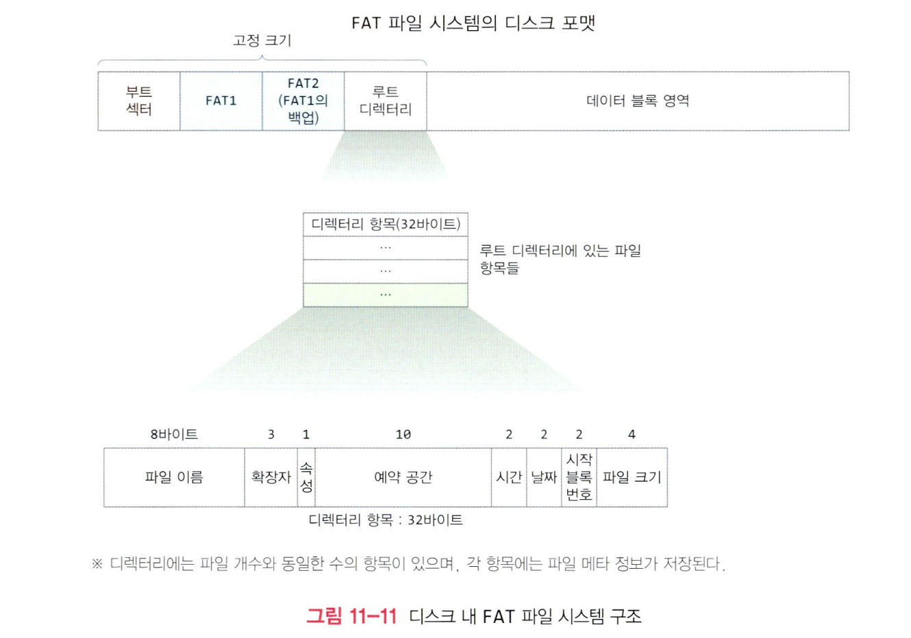 - FAT가 훼손되면 파일을 찾을수없기 때문에 FAT2를 복사본으로 둔다.
