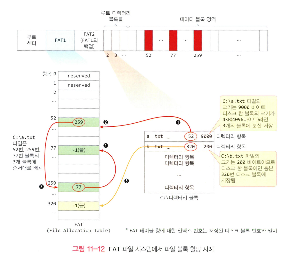 - FAT 파일 시스템은 파일 데이터를 블록 단위로 디스크에 분산 저장하고 저장된 위치는 FAT 테이블에 기록