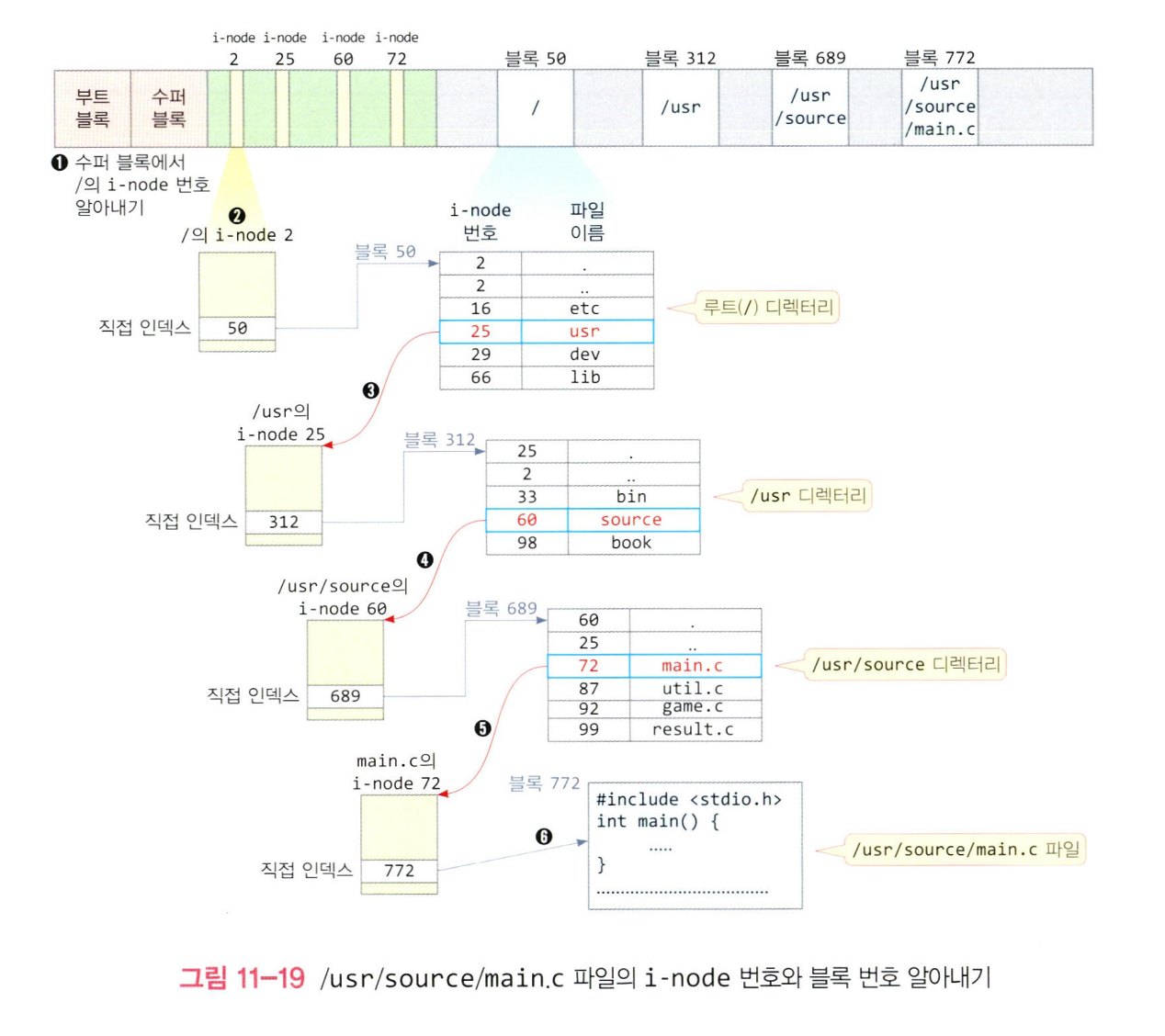 - 파일의 경로명으로부터 파일의 i-node를 찾는 과정, 커널에 의해 이루어짐
