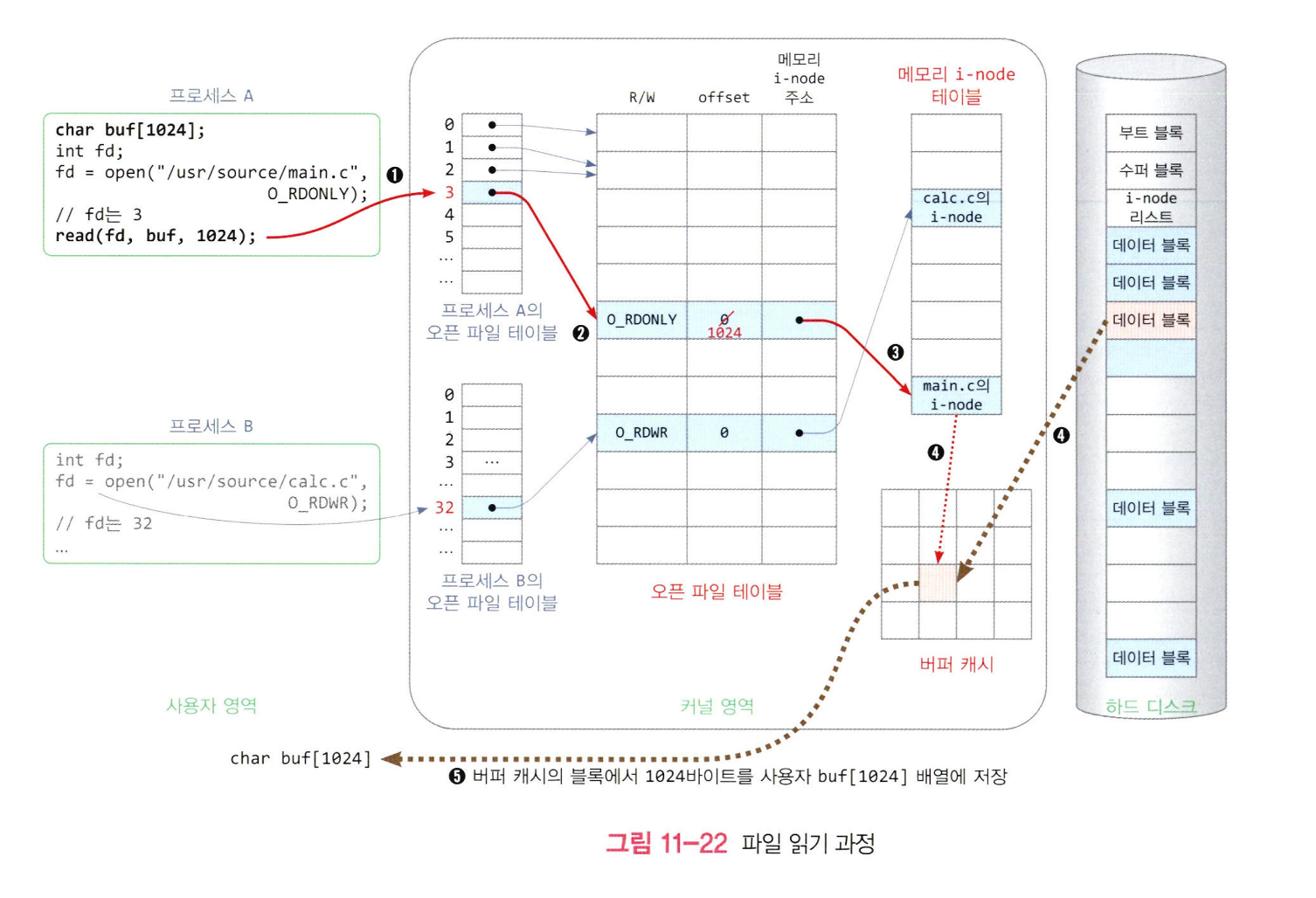 - 프로세스 별 오픈 파일 테이블 항목에 기록된 오픈 파일 테이블 주소를 따라 오픈 파일 테이블 항목을 액세스하고, 기록된 열기 모드를 검사하여 파일을 읽을 수 있는지 확인한 다음, 옵셋의 파일 위치에서 파일을 읽고 읽은 바이트 만큼 옵셋을 증가시킨다.