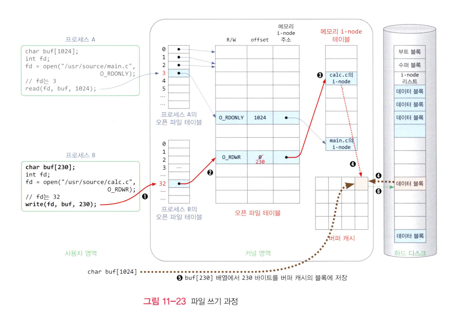 - 프로세스별 오픈 파일 테이블의 항목에 기록된 오픈 파일 테이블 주소를 따라 오픈 파일 테이블 항목을 액세스하고 이곳에 기록된 열기 모드를 검사하여 파일 쓰기가 가능한지 확인한 다음, 옵셋에 기록된 파일 ㅜ이치에서부터 파일에 기록하고 기록한 바이트 만큼 옵셋을 증가시킨다.
