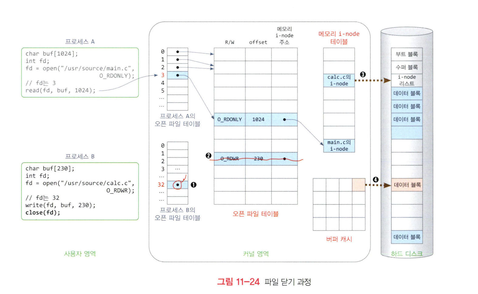 - 프로세스 별 오픈 파일 테이블의 항목과 파일 테이블 항목을 반환하고, 메모리 i-node가 수정되었다면 디스크 i-node에 저장한다.
